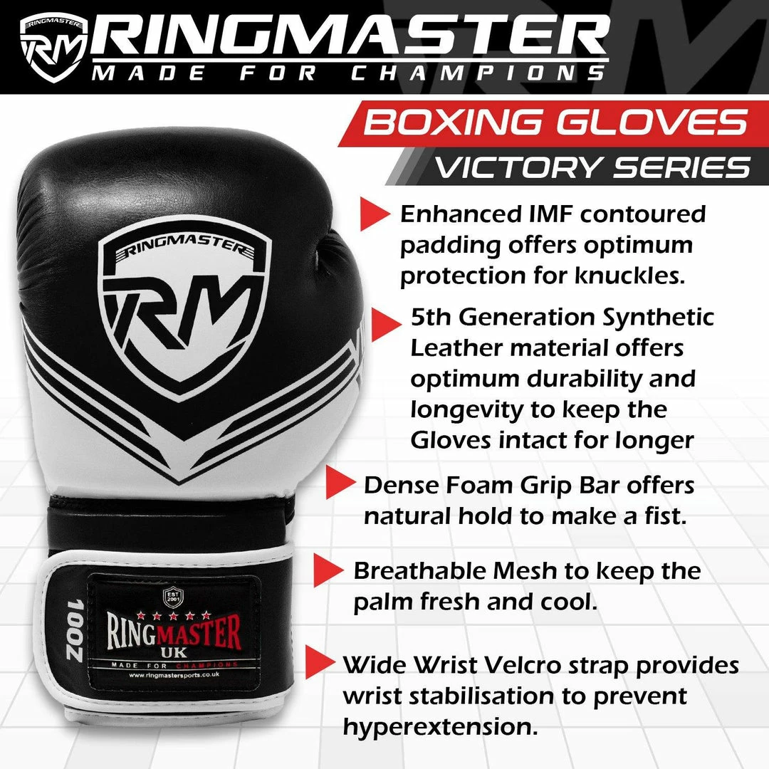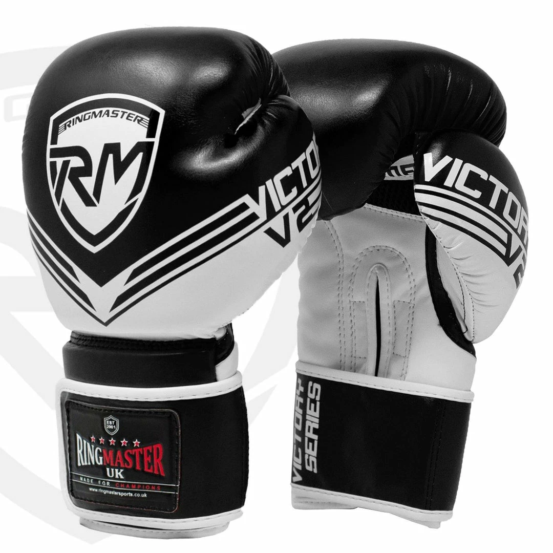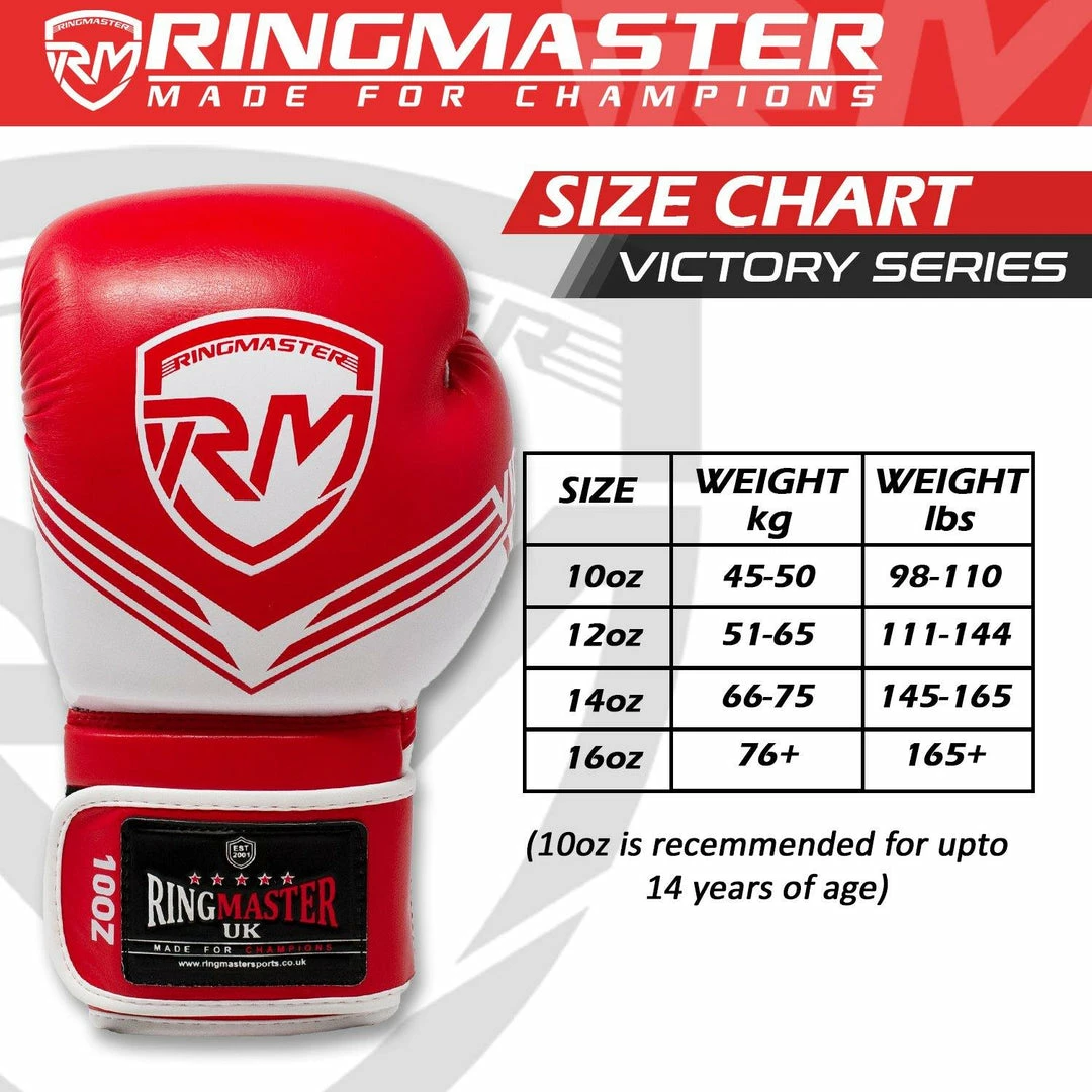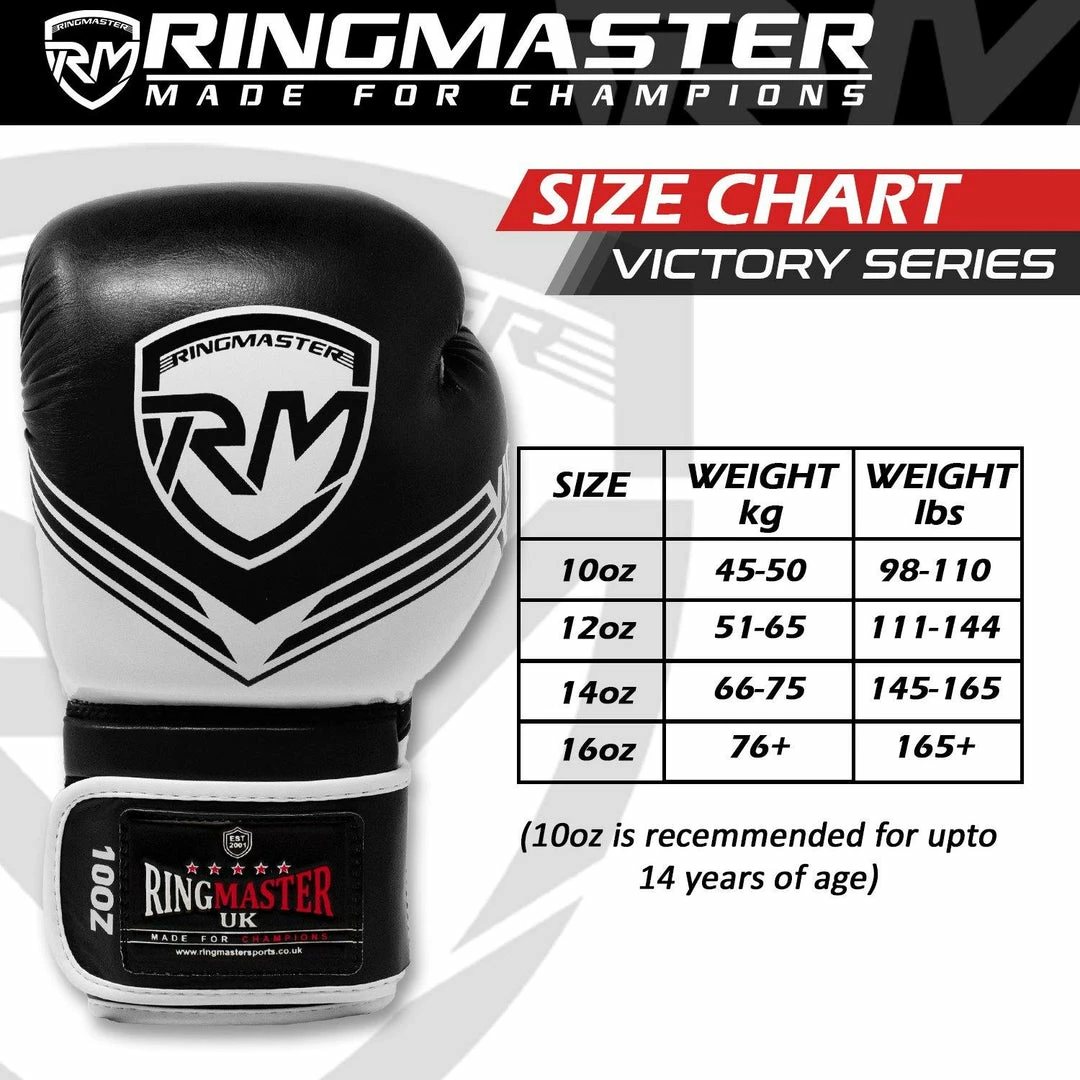 •BE VICTORIOUS: The 2nd Generation RingMaster Victory Series V2 Boxing Gloves is designed to offer maximum protection with snug fitting. The gloves are made of 5th generation synthetic leather which is more durable than its predecessors and can be used for sparring or training on the punch bags, focus pads or mitts. They come in 8 oz, 10 oz, 12 oz, 14 oz & 16 oz.