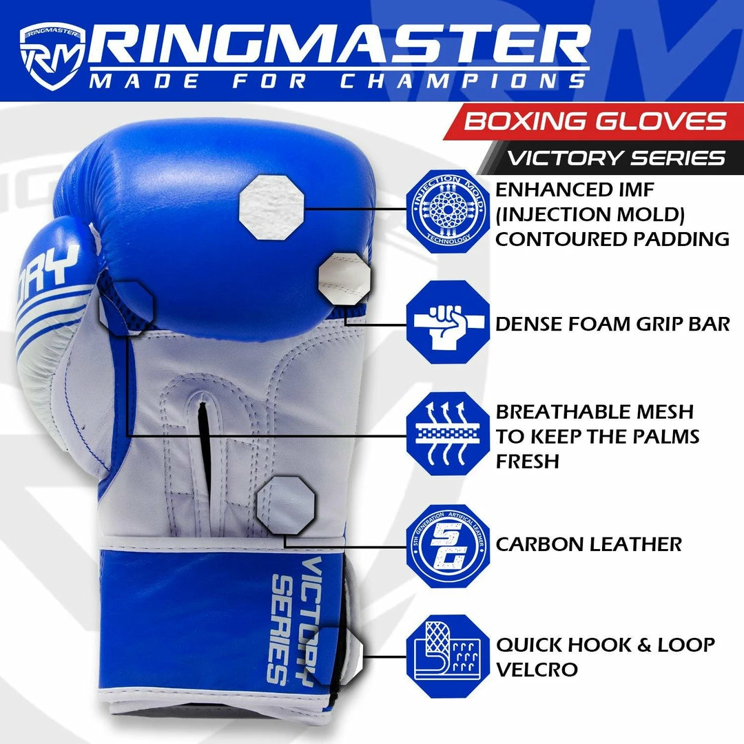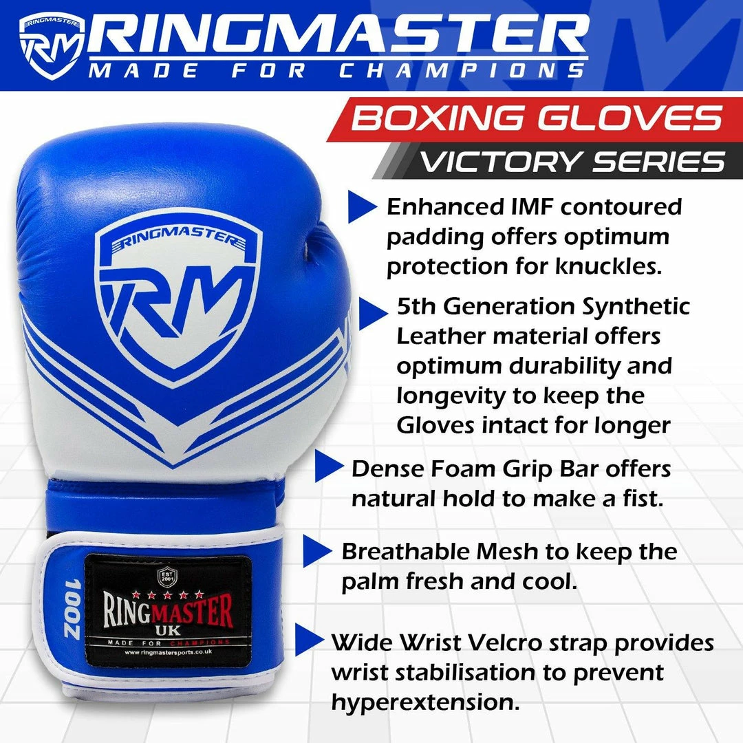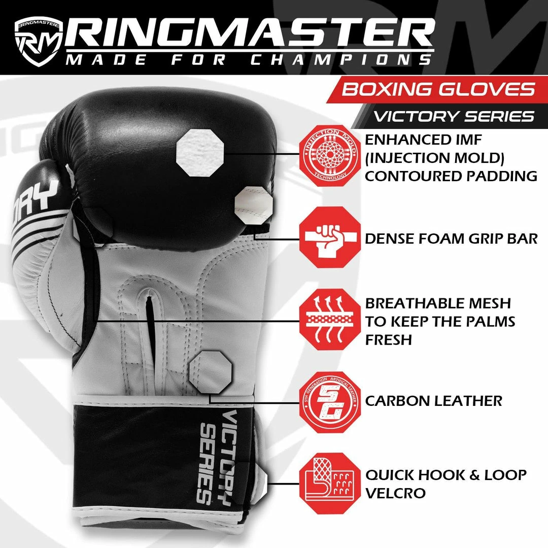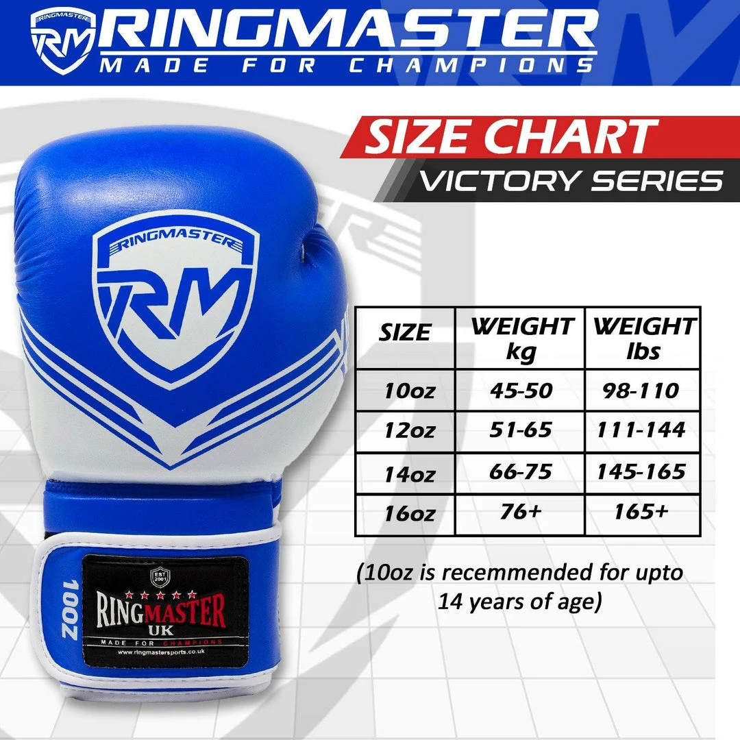 •BE VICTORIOUS: The 2nd Generation RingMaster Victory Series V2 Boxing Gloves is designed to offer maximum protection with snug fitting. The gloves are made of 5th generation synthetic leather which is more durable than its predecessors and can be used for sparring or training on the punch bags, focus pads or mitts. They come in 8 oz, 10 oz, 12 oz, 14 oz & 16 oz.