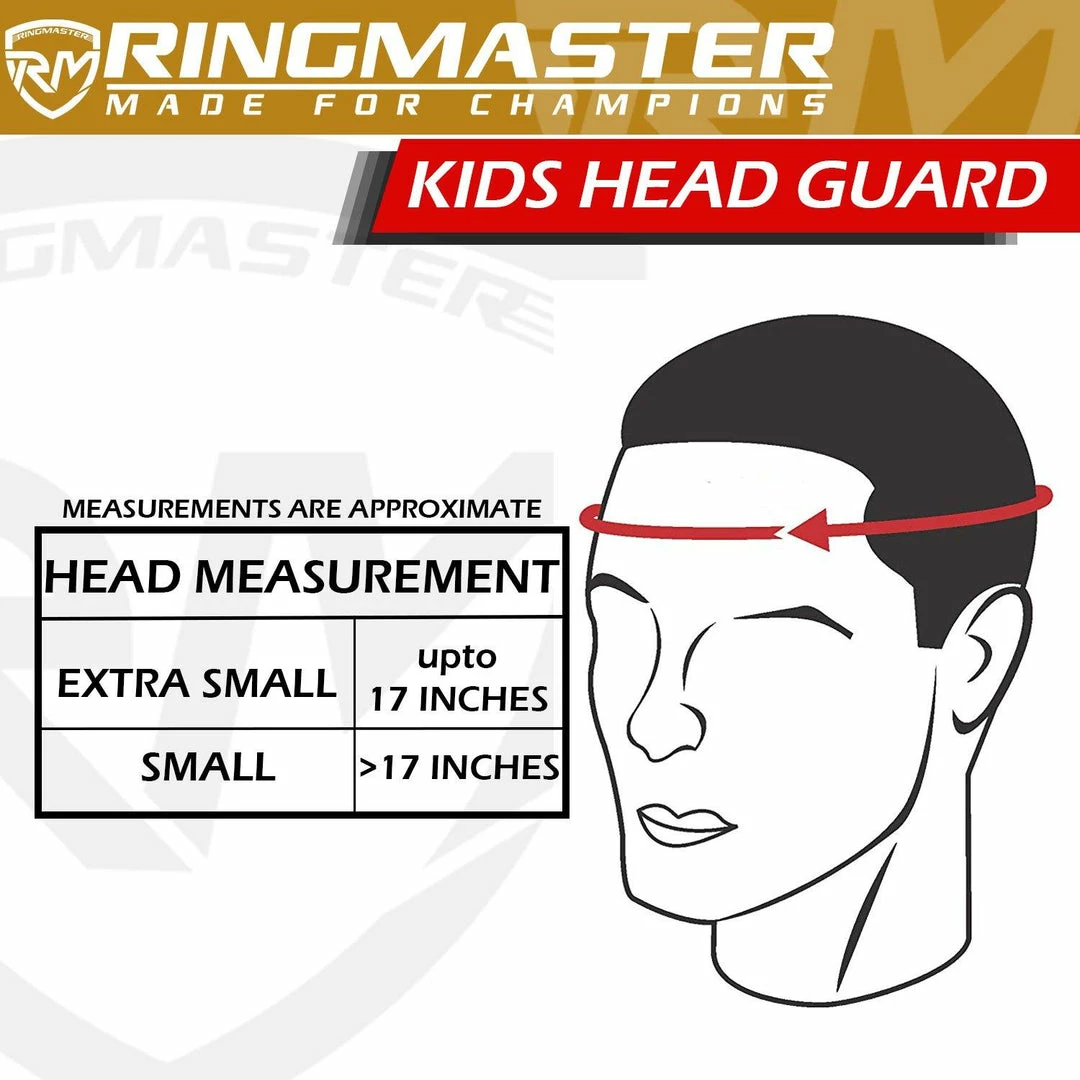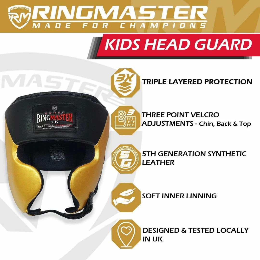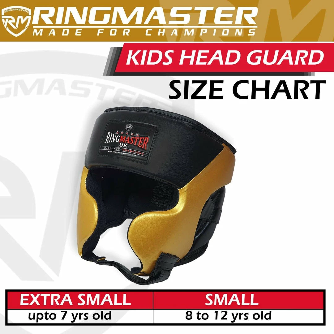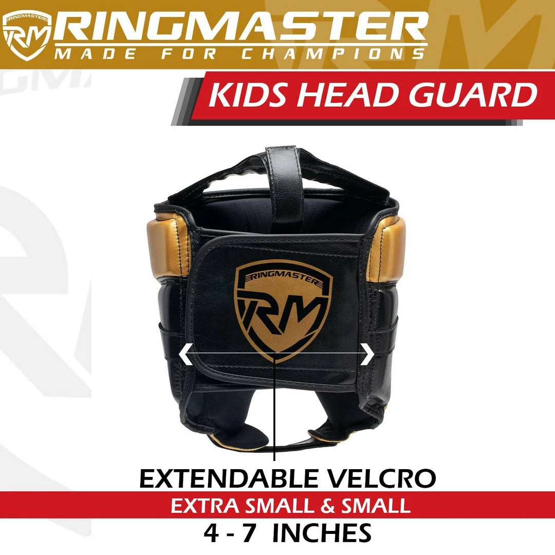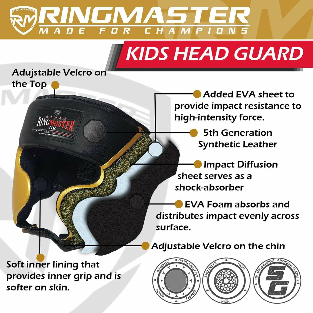The RingMaster Sports Synthetic Leather Head Guards Black and Gold are constructed for high level of safety.