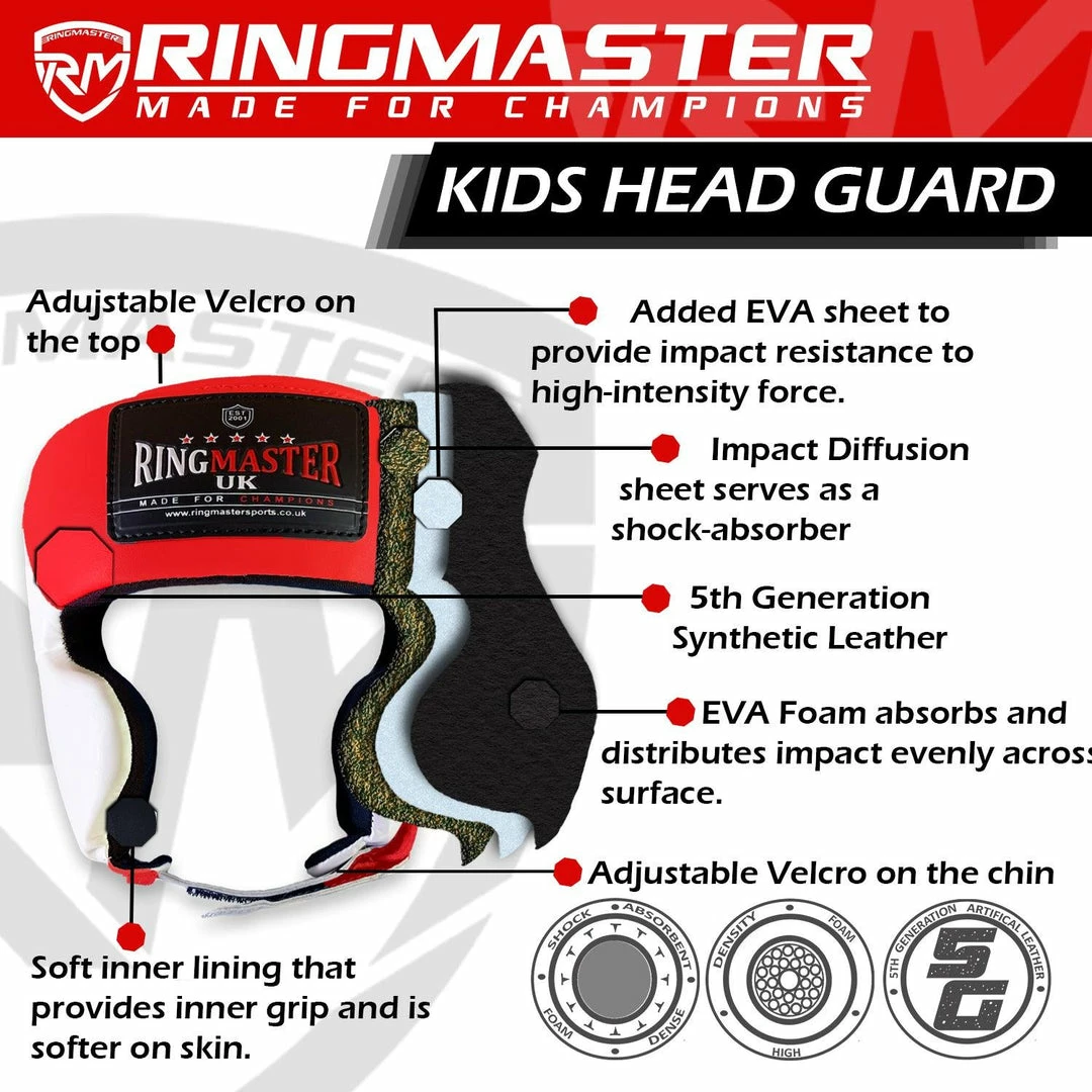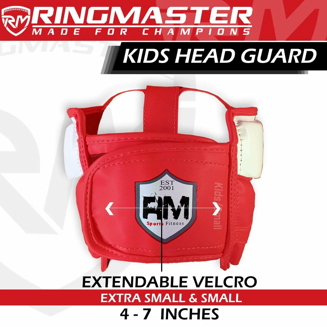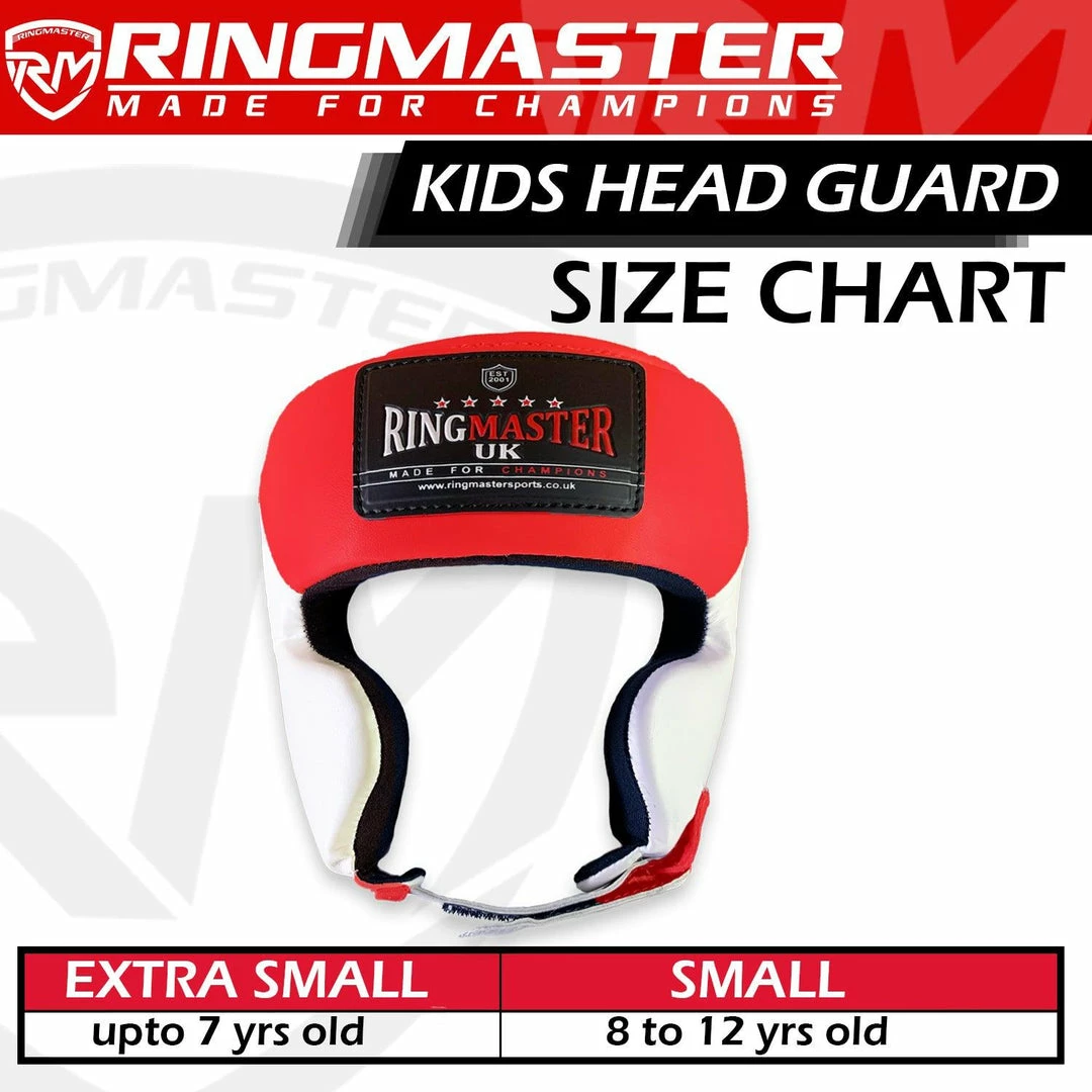 The RingMaster Sports Synthetic Leather Head Guards Red and White are constructed for high level of safety.