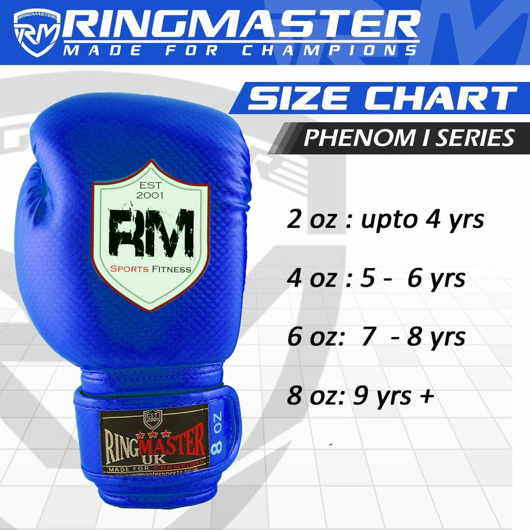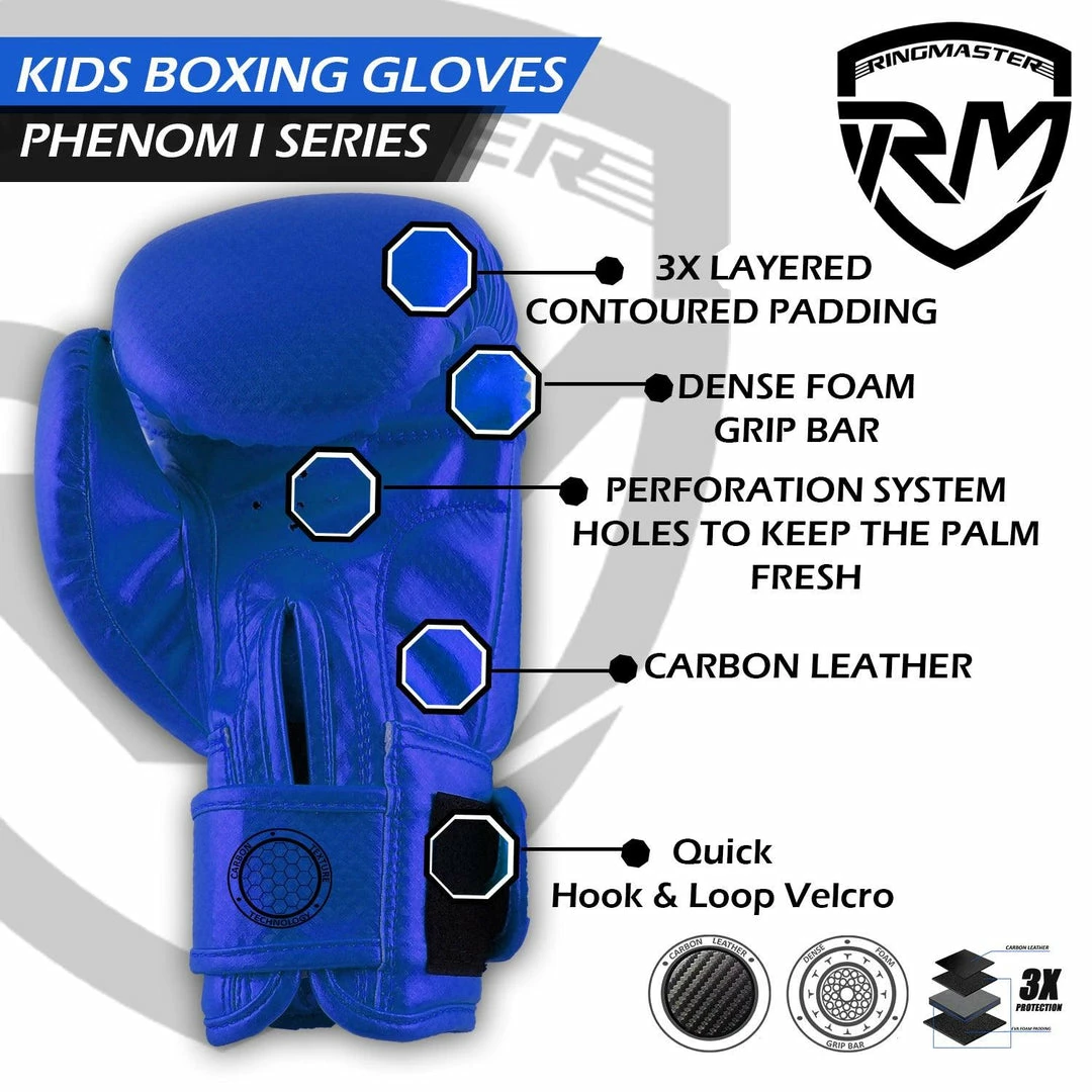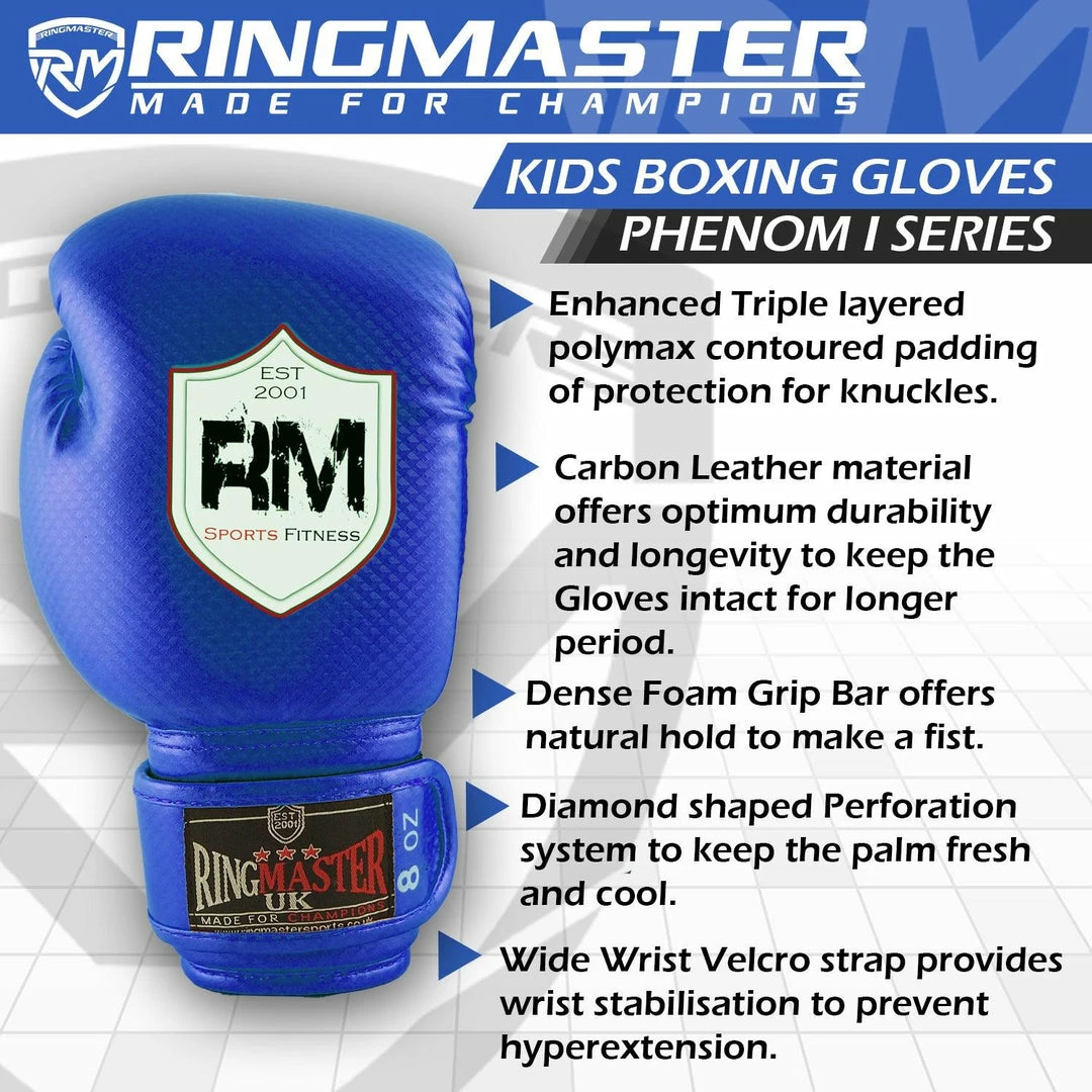 - GET THEM TO BE A MASTER: The latest RingMaster Sports Phenom Series are designed to offer maximum protection to your kids while they throw punches on pads, bags and pretty much anything or anyone. The Blue Kids Boxing gloves comes in a portable packaging which can be carried around easily in anything and anywhere.