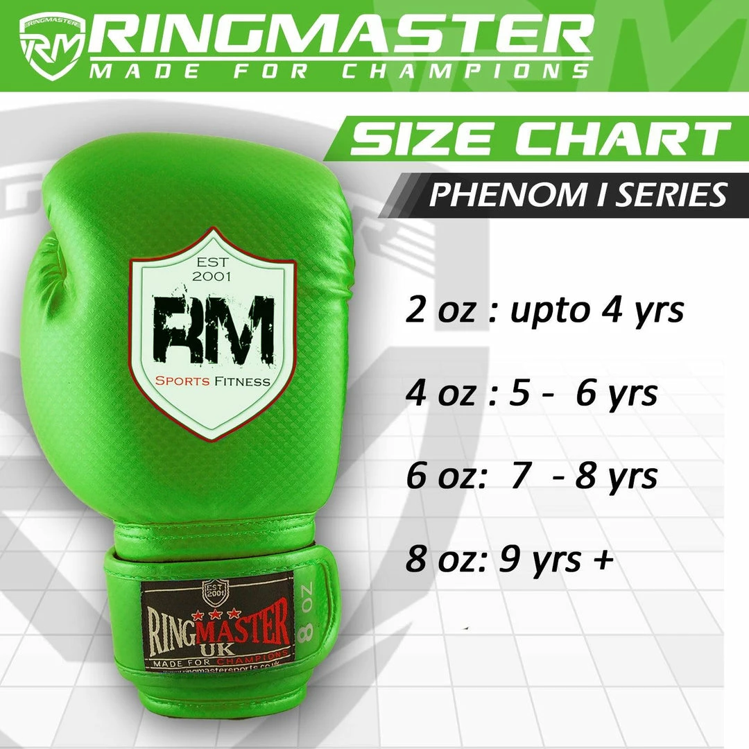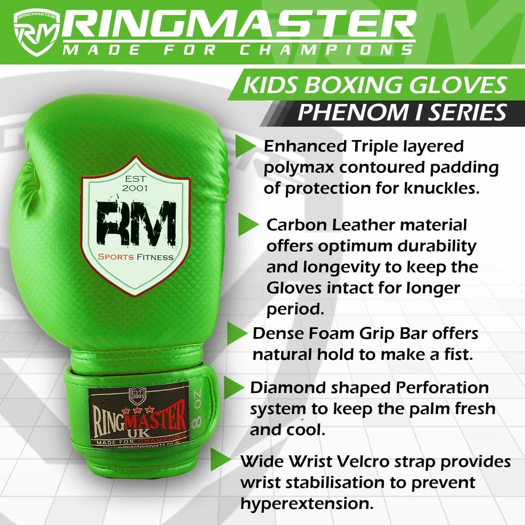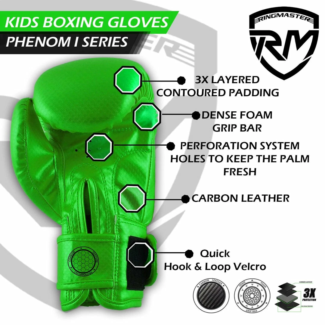 - GET THEM TO BE A MASTER: The latest RingMaster Sports Phenom Series are designed to offer maximum protection to your kids while they throw punches on pads, bags and pretty much anything or anyone. The Green Kids Boxing gloves comes in a portable packaging which can be carried around easily in anything and anywhere.