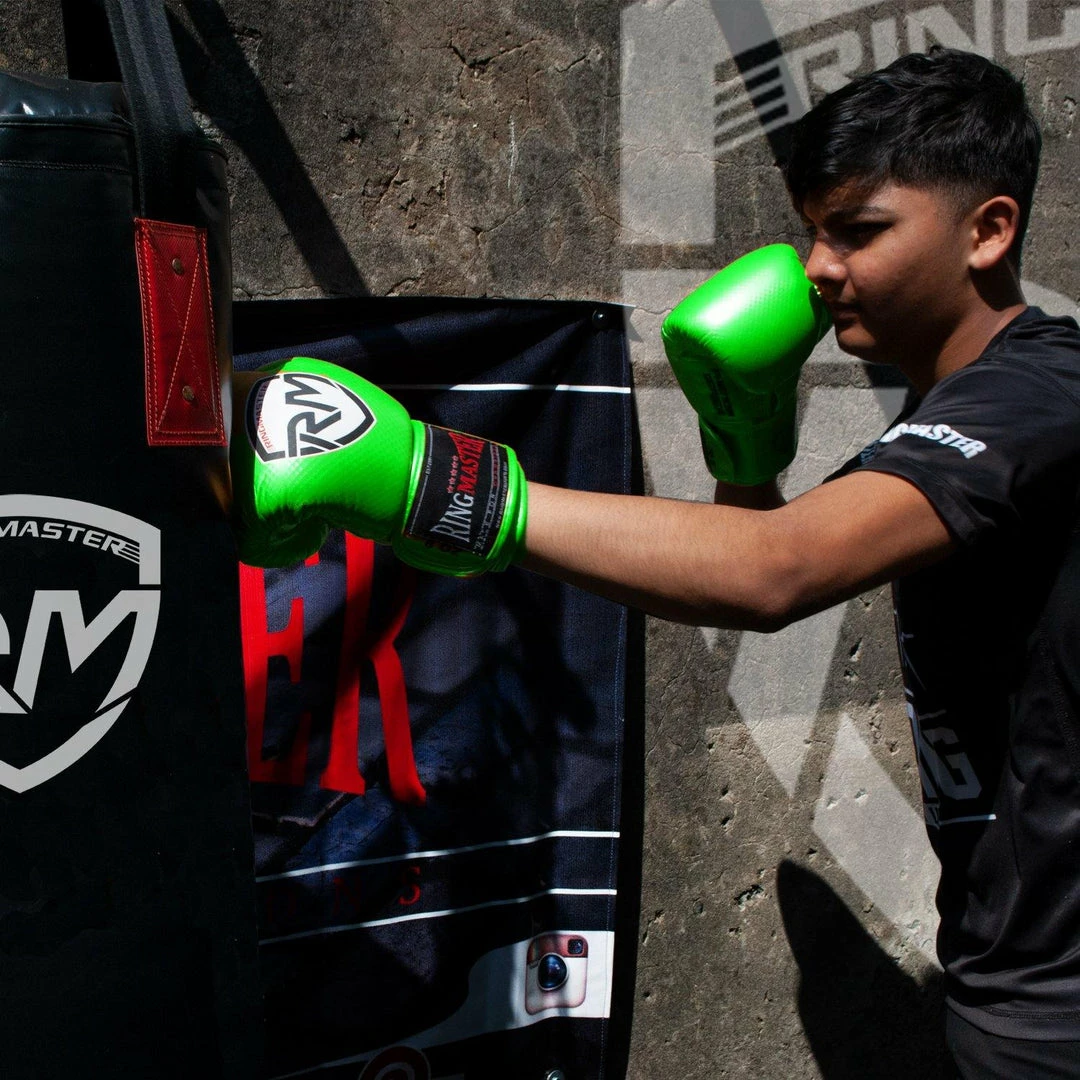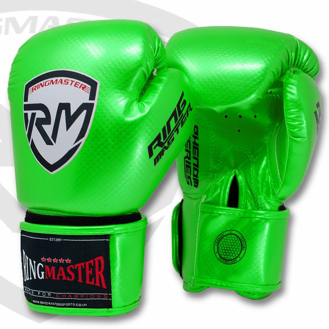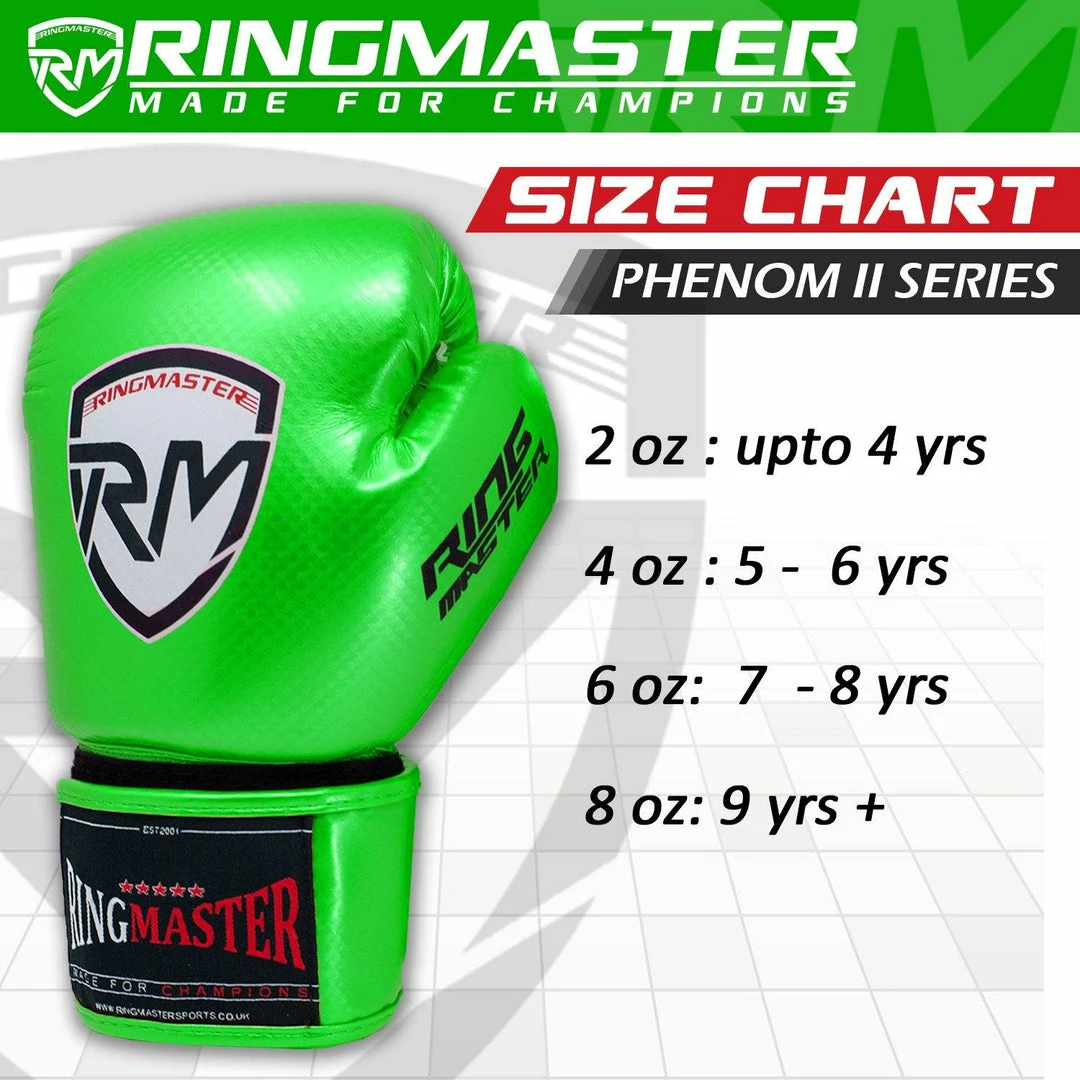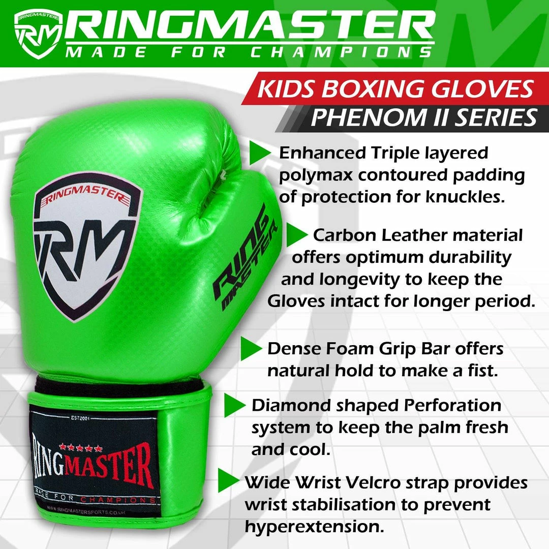 - GET THEM TO BE A MASTER: The latest RingMaster Sports Phenom Series are designed to offer maximum protection to your kids while they throw punches on pads, bags and pretty much anything or anyone. The Green Kids Boxing gloves comes in a portable packaging which can be carried around easily in anything and anywhere.